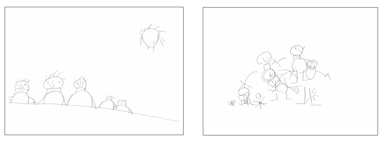 Nem megyek bele a rajzok elemzésébe, mert nem az én asztalom, csak szeretném felvillantani, hogy mennyire megváltozik a rajz dinamikája, struktúrája és ezáltal mondanivalója is, ha becsukott szemmel történik a rajzolás. Jelen esetben a családtagok lineáris felsorolását felváltotta egy egészen más kritériumok szerinti ábrázolás. Nem kell megijedni tőle! Az elsőre zavarosnak látszó formavilág mögött egy kihámozható értelmezés bújik meg.