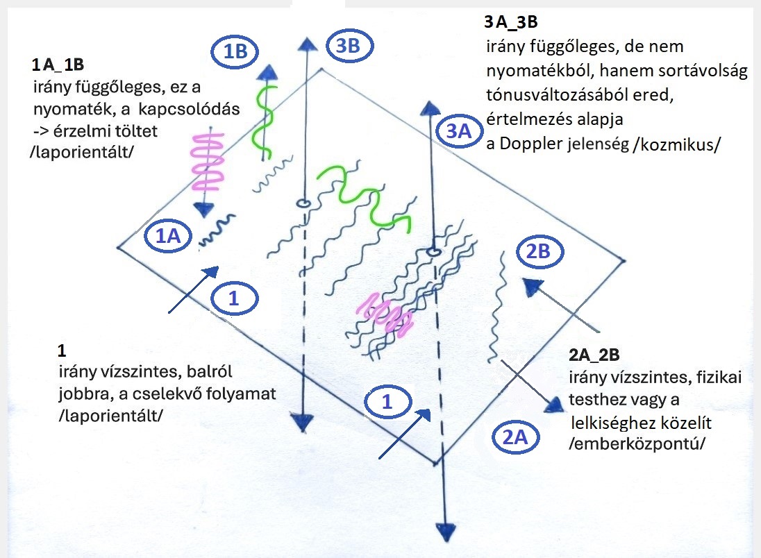 Izgalmas és felkavaró meglátásokat közvetít ez a függőleges vektorirány. Az erő, amit képvisel, a szemünk számára vízszintesen bontakozik ki, méghozzá úgy, hogy a sortávolságokat hullámhossznak értelmezzük. Az ember itt szembesülhet azzal, hogy amit lát, az nem az, aminek mutatja magát, hanem teljesen más mondanivalóval rendelkezik. A sortávolságok tónusai nem csak a látvány perspektív aspektusát, de a frekvenciák magas és mély tulajdonságait, azaz dinamikáját is elénk tárja. Ez a jelenség, ami a csukott szemes kézírásban komplex módon tud megjelenni és értelemmel feltöltődni, egy plusz dimenzióval ajándékoz meg bennünket.